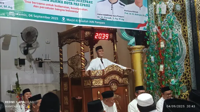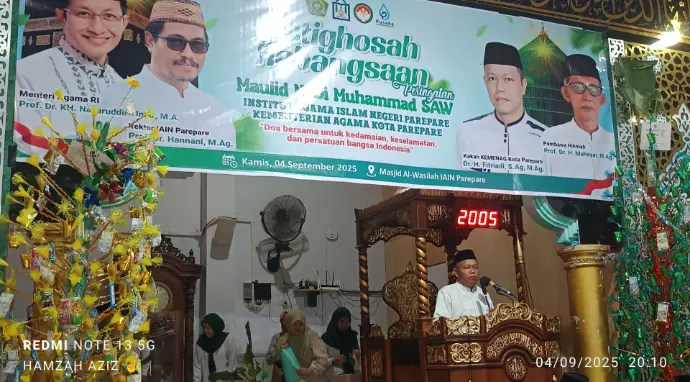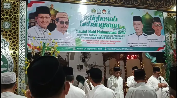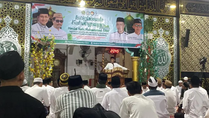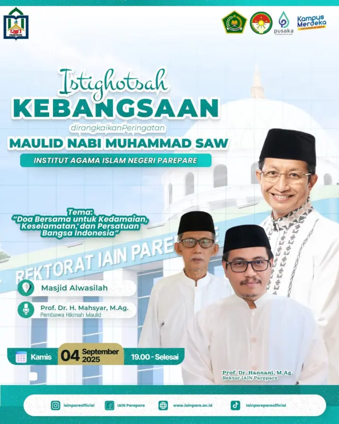 Parepare, 4 September 2025 – Institut Agama Islam Negeri (IAIN) Parepare kembali menjadi ruang perjumpaan intelektual dan spiritual umat. Hal ini tampak dalam pelaksanaan Istighosah Kebangsaan yang dirangkaikan dengan Peringatan Maulid Nabi Besar Muhammad SAW, Kamis (4/9/2025), bertempat di Masjid Al-Wasilah IAIN Parepare.